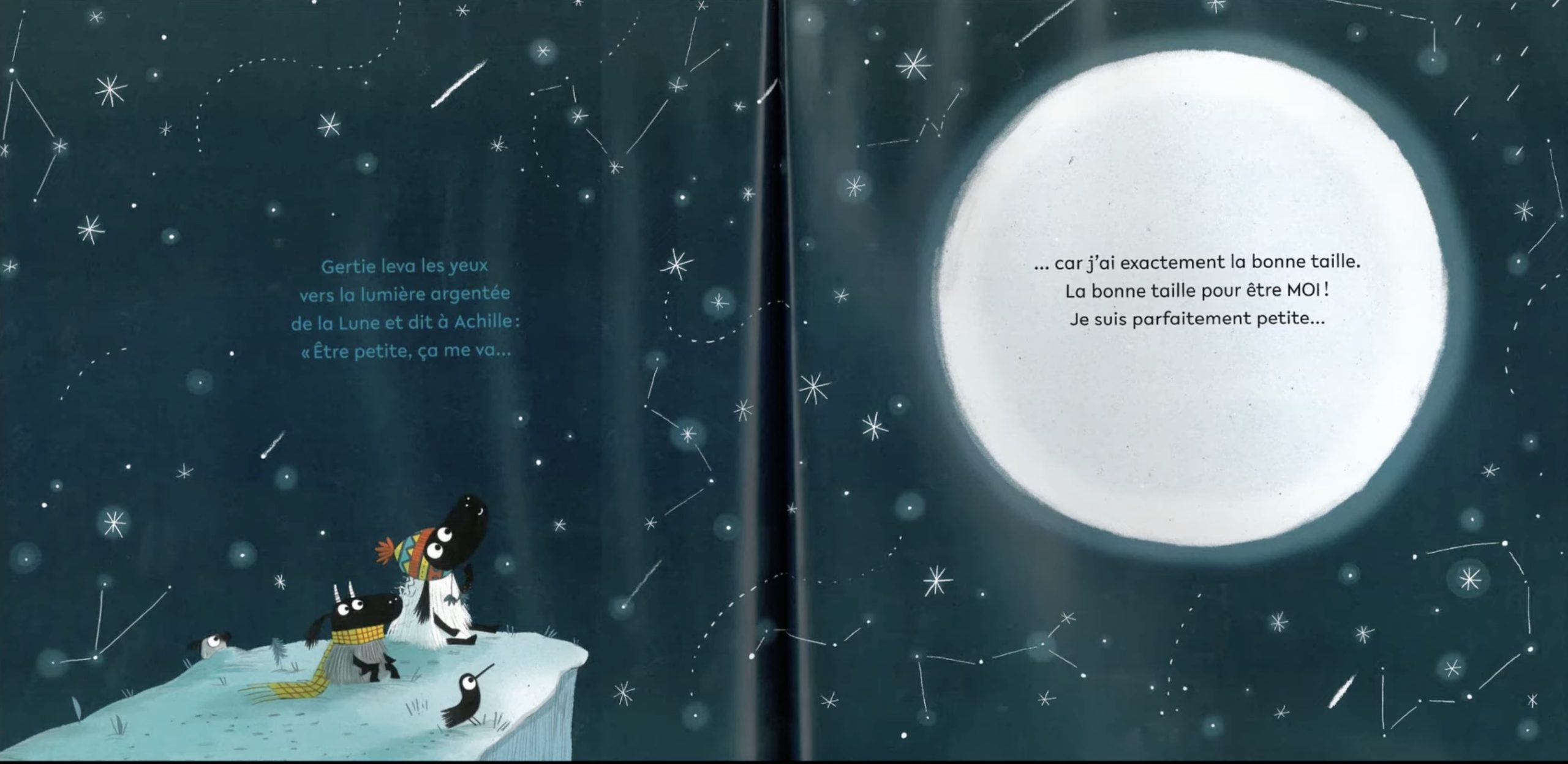 Ce passage est important car il montre le moment où Gertie accepte enfin qui elle est. Elle comprend qu’elle n’a pas besoin de devenir plus grande pour avoir de la valeur car elle est déjà à la bonne taille pour être elle-même. L’image de la grande lune face à la petite yack montre que l’on peut être petit sans être insignifiant. Ce passage transmet un message fort aux enfants. Chacun est important tel qu’il est, sans avoir besoin de changer ou de grandir pour compter.