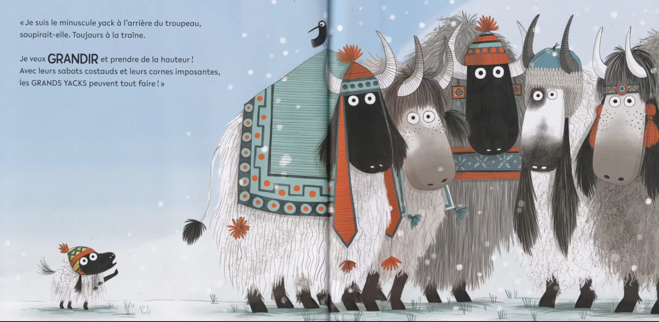 Les illustrations sont simples avec des images assez grandes pour recouvrir entièrement chaque page, ce qui facilite la lecture pour les enfants. De plus, les dessins représentent bien l’habitat des yacks qui vivent principalement en haute montagne, dans l’Himalaya et sur le plateau tibétain ce qui rend l’histoire cohérente avec le cadre naturel du récit.